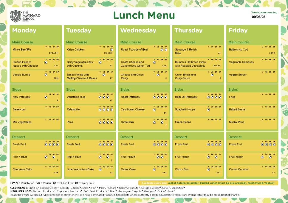 It is compulsory for pupils up to Upper 3 (Year 7) to have school meals. Older girls can opt to have school lunches on a termly basis, or they may bring in a packed lunch each day. For a taste of what may be served on an average week, take a look at the sample lunch menu below. Parents can view menus week-to-week on the Parent Portal.