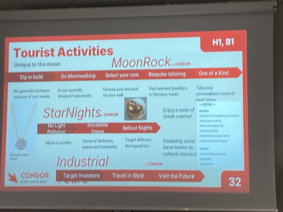 After an intense day of collaboration on Saturday, the team worked late into the evening to meet their 8AM Sunday presentation deadline, then presented to a panel of expert judges: they chose the Shackleton crater, situated near the South Pole of the Moon, for their ambitious lunar base, placing their garden city under a vast transparent dome spanning the crater. Although they weren’t the overall winners, they still hugely impressed the judges with a fascinating and comprehensive presentation that addressed every aspect of the brief.