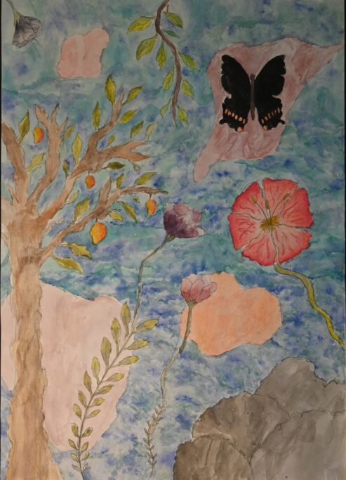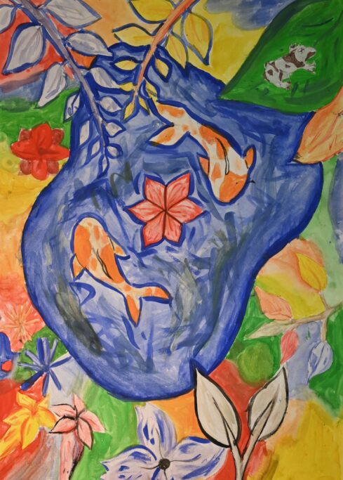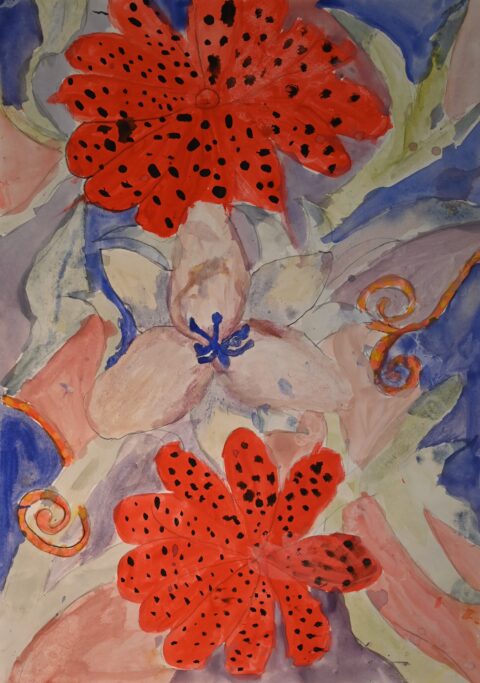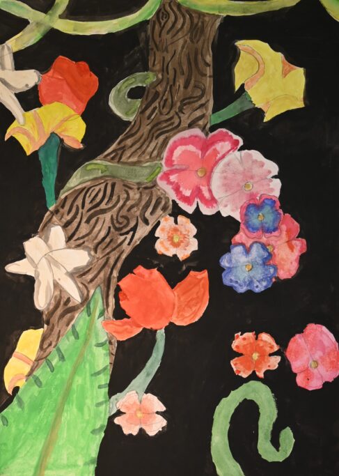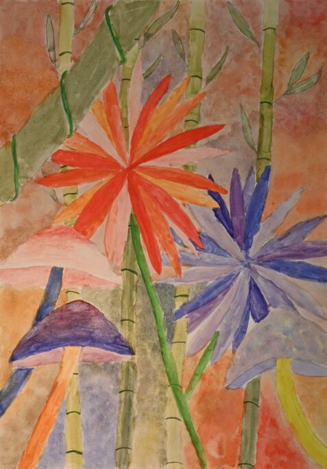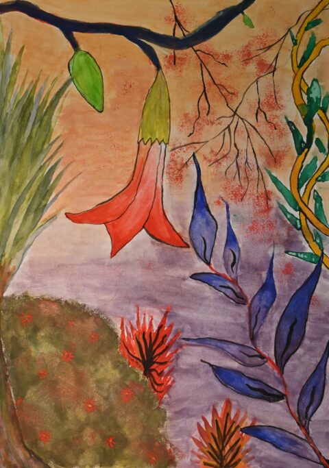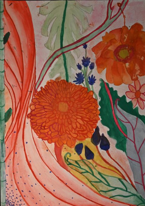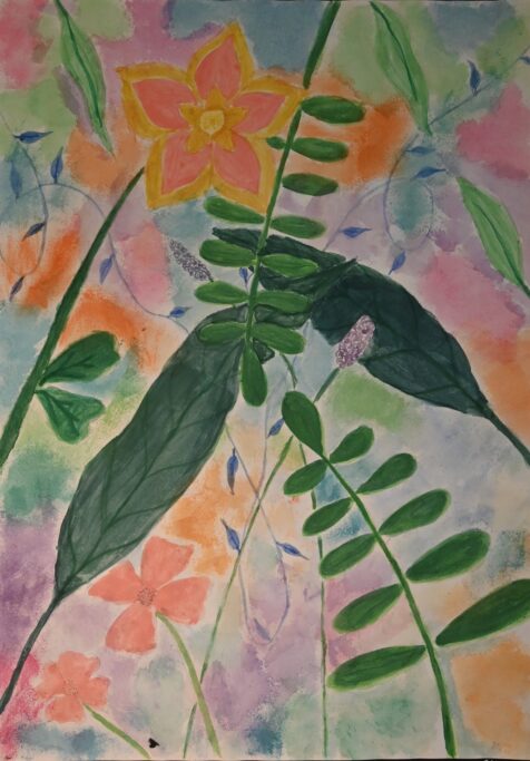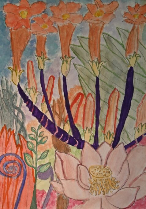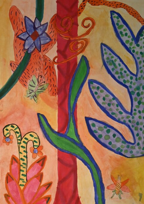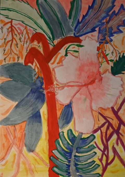 Studying artists such as Henri Rousseau and Nick Aston, as well as traditional botanical illustration, they were invited to create their own fantastical jungle images. As well as using their own observational drawings and photographs, the students were given the freedom to bring new colour to the overlapping shapes and forms.